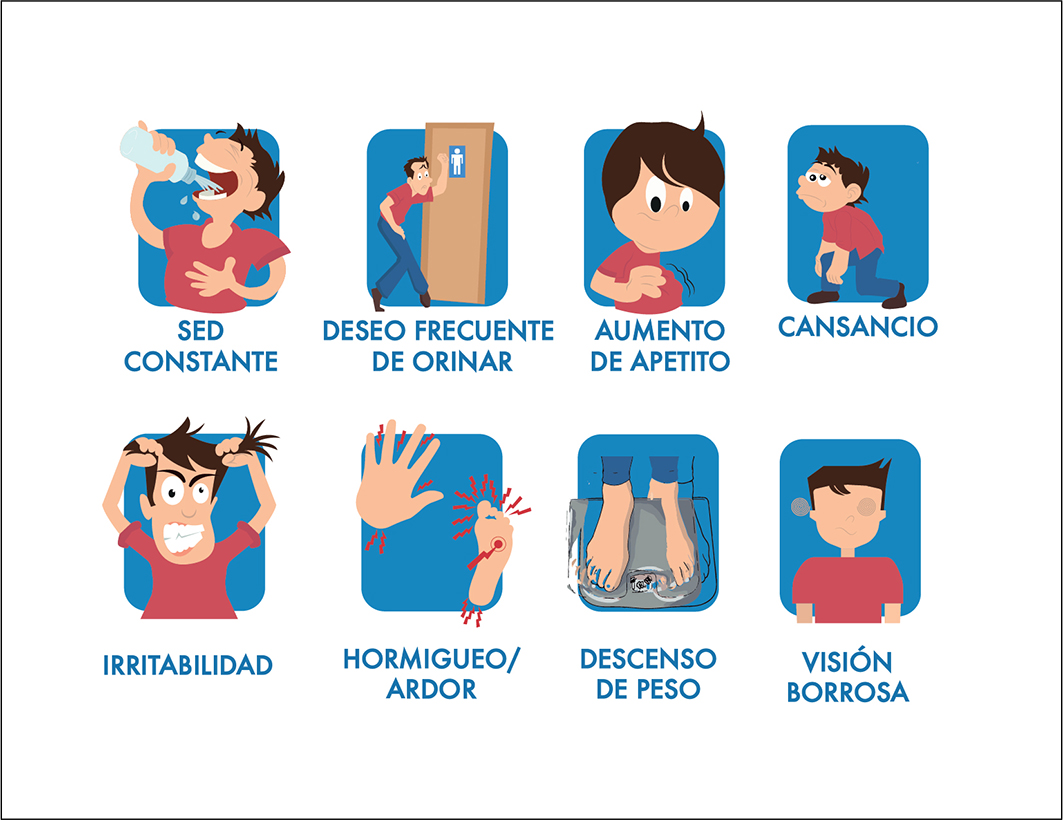 La diabetes afecta a TODO el organismo. Con frecuencia la enfermedad inicia con manifestaciones vagas o generales. Los pacientes pueden presentar “solamente” mayor apetito, aumento en la sed y exceso de orina; pueden perder peso de manera importante. También pueden sentir fatiga, cansancio, calambres u hormigueo en sus extremidades o presentar visión borrosa.