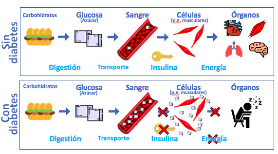 En todos los casos la falla es la misma: una deficiencia en la acción o producción de insulina que deriva en un aumento sostenido del nivel de glucosa en sangre.